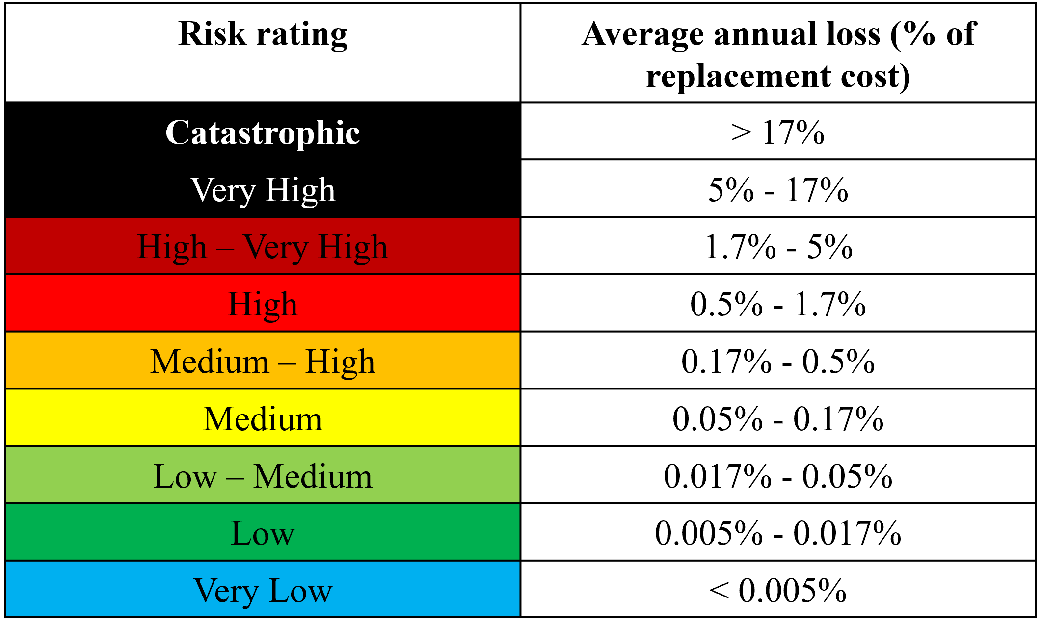 The “risk matrix” relates the likelihood of an impacting event and the associated consequence to a “risk rating” (or “qualitative descriptor of risk”). The makeup of the risk matrix depends on the risk metric(s) being assessed and the risk tolerance of the client. In many cases, the risk matrix is calibrated such that each qualitative descriptor corresponds to a range of average annual loss (AAL). In such cases, an "AAL table" can be developed that is associated with the risk matrix.